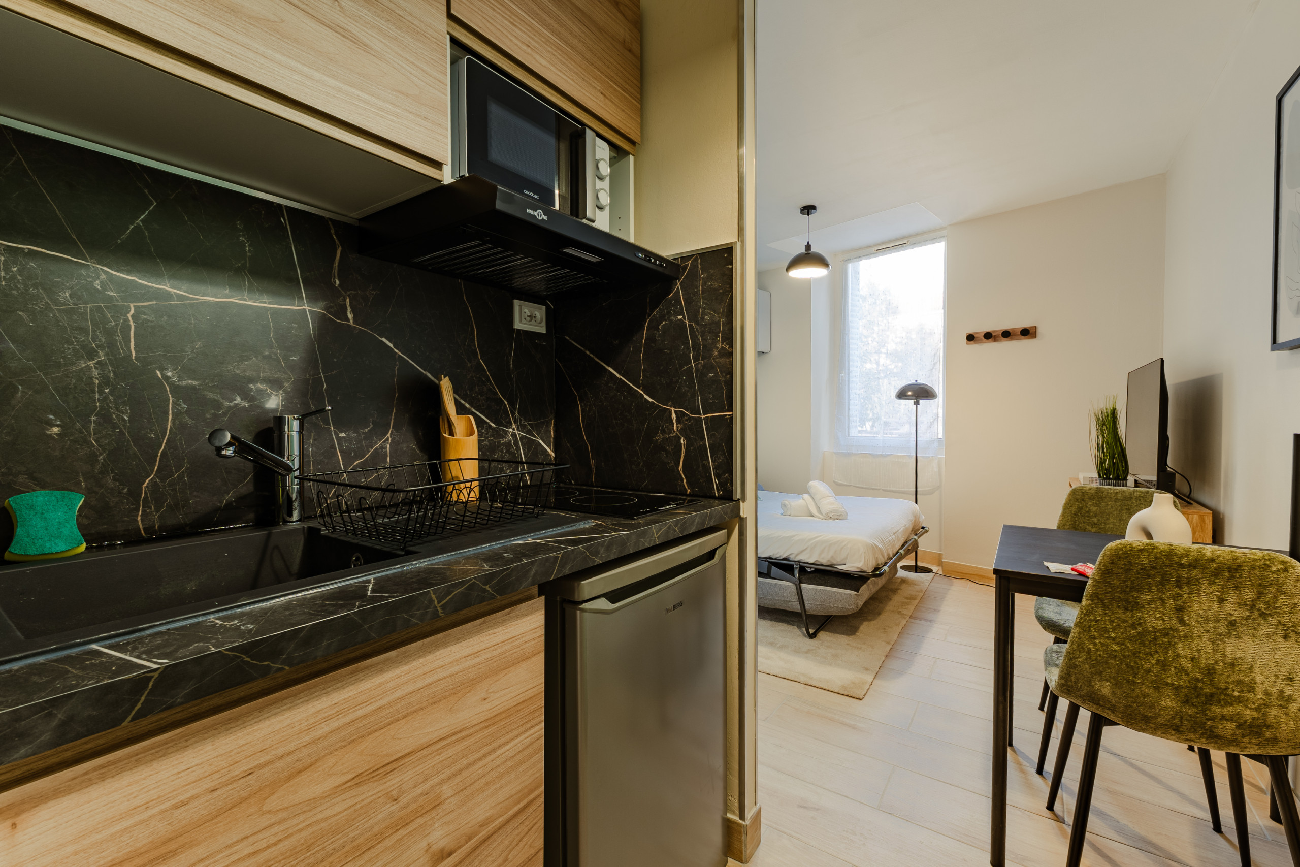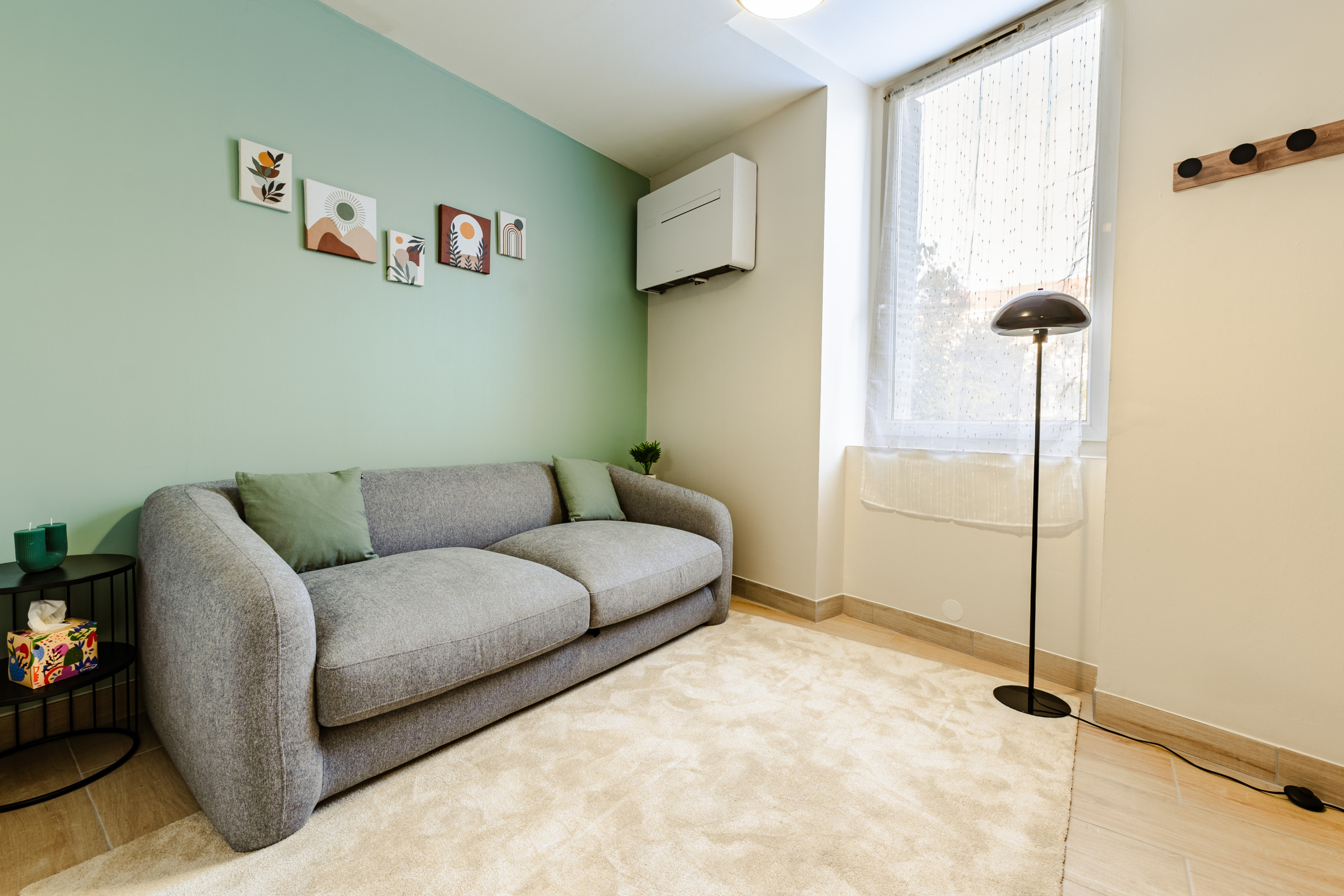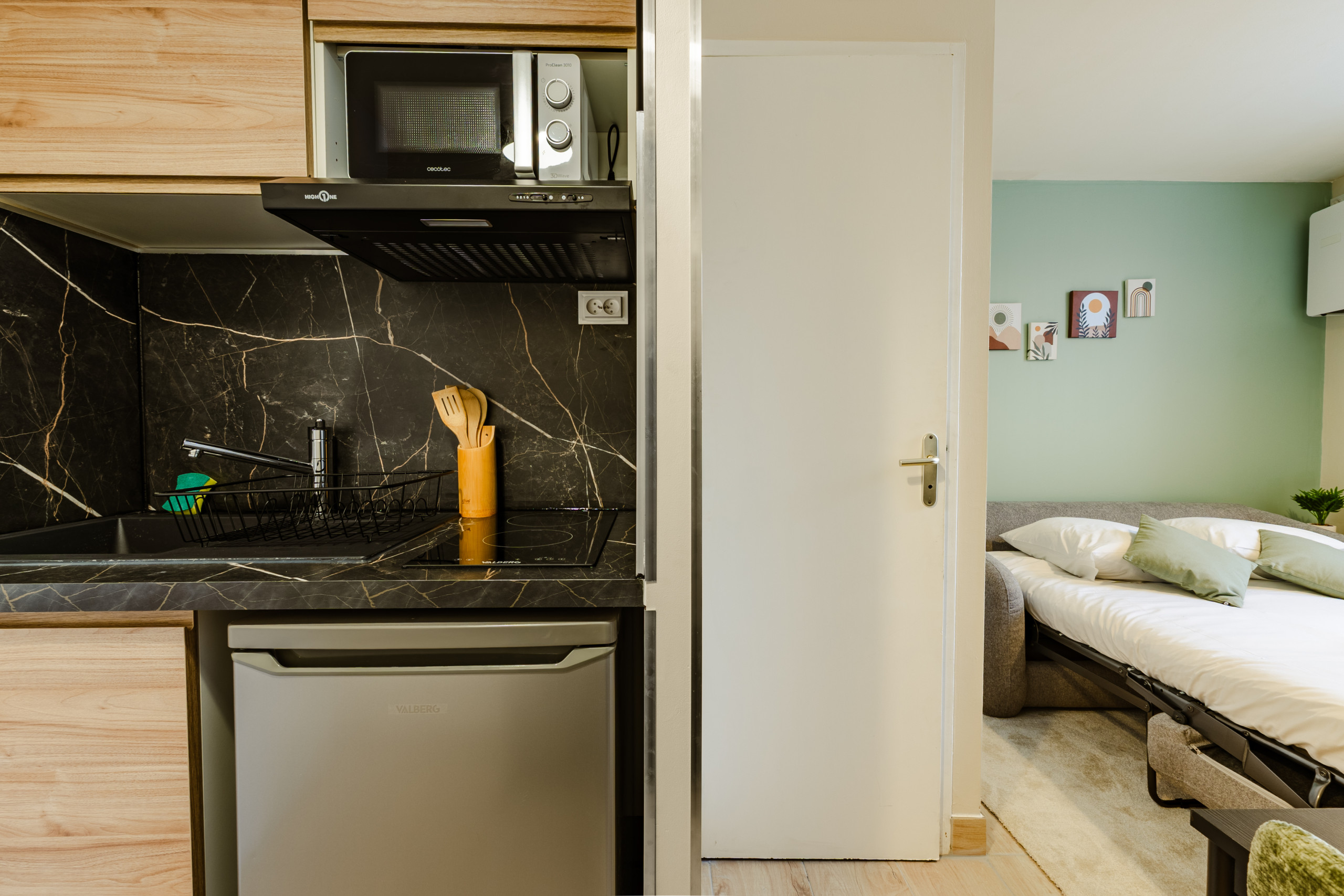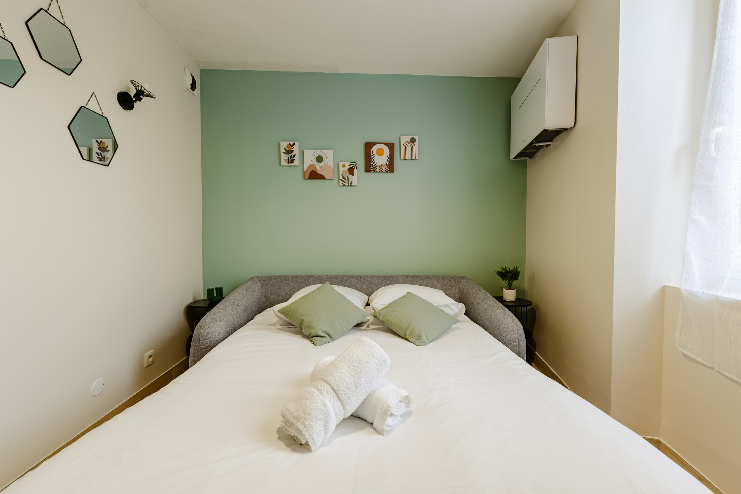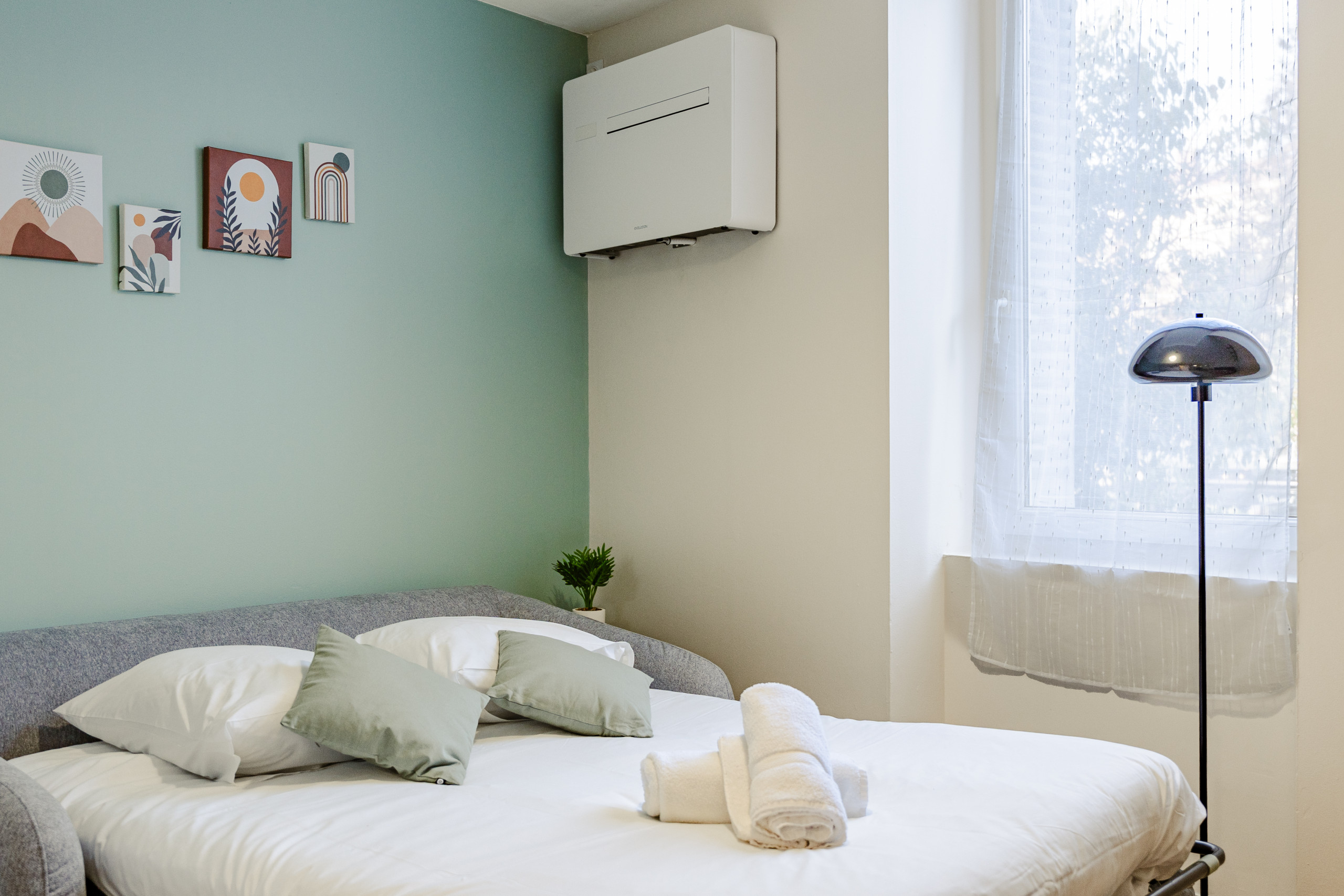 Appartement à Valence qui possède 1 chambre(s) et Capacité pour 2 personnes. Logement de 16 m². Elle dispose de chauffage pompe à chaleur, TV.La cuisine américaine, à induction, est équipée avec réfrigérateur, micro-ondes, vaisselle/couverts, ustensiles/cuisine et bouilloire.