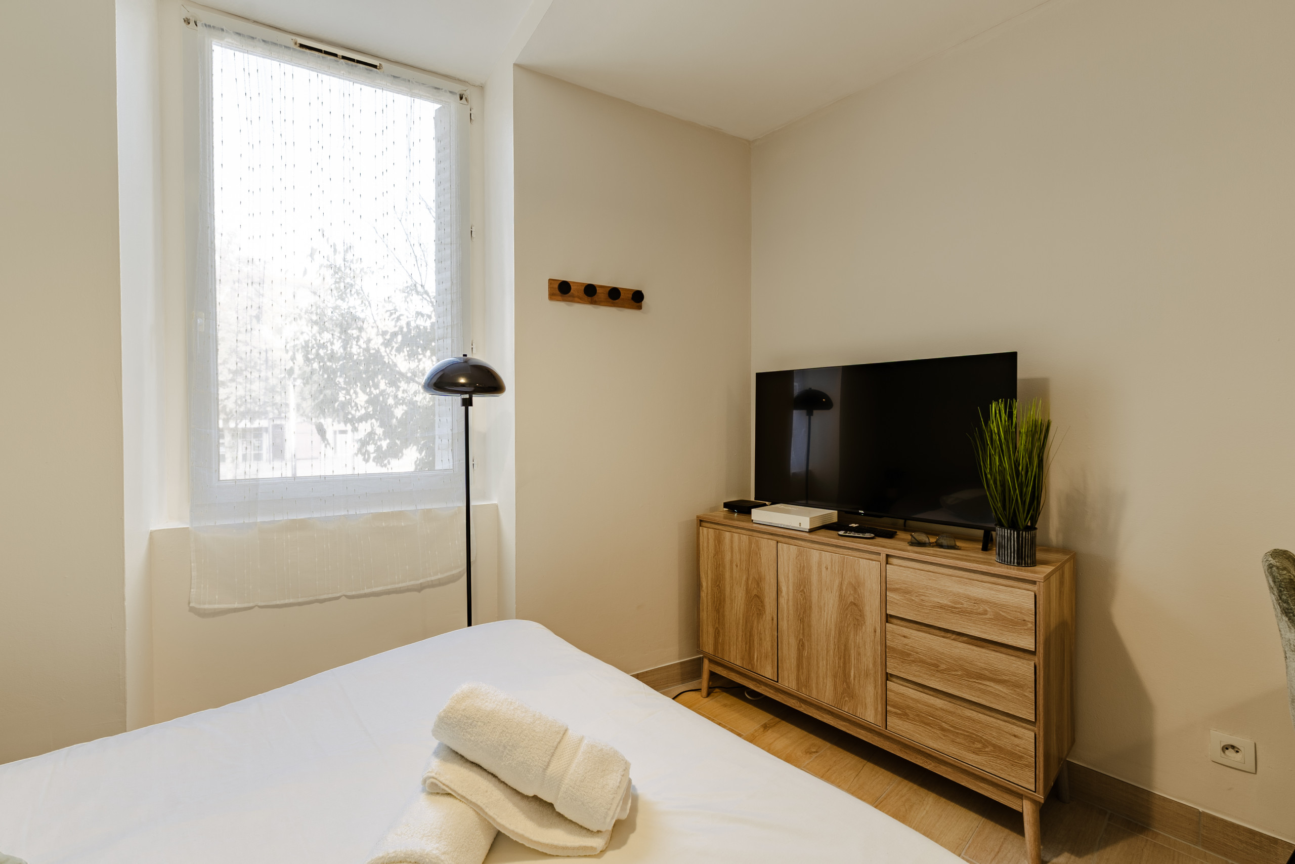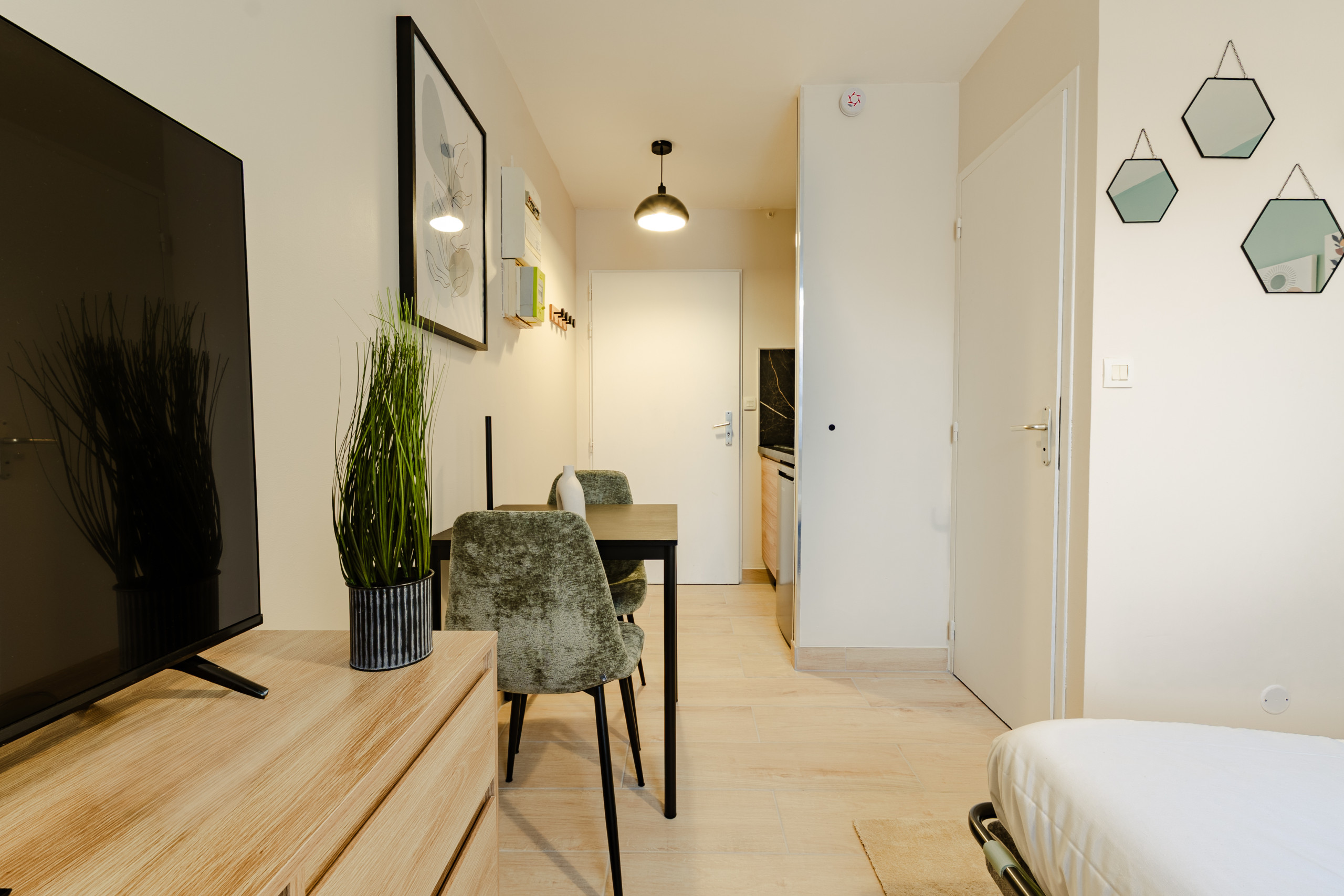 Appartement à Valence qui possède 1 chambre(s) et Capacité pour 2 personnes. Logement de 16 m². Elle dispose de chauffage pompe à chaleur, TV. La cuisine américaine, à induction, est équipée avec réfrigérateur, micro-ondes, vaisselle/couverts, ustensiles/cuisine et bouilloire.